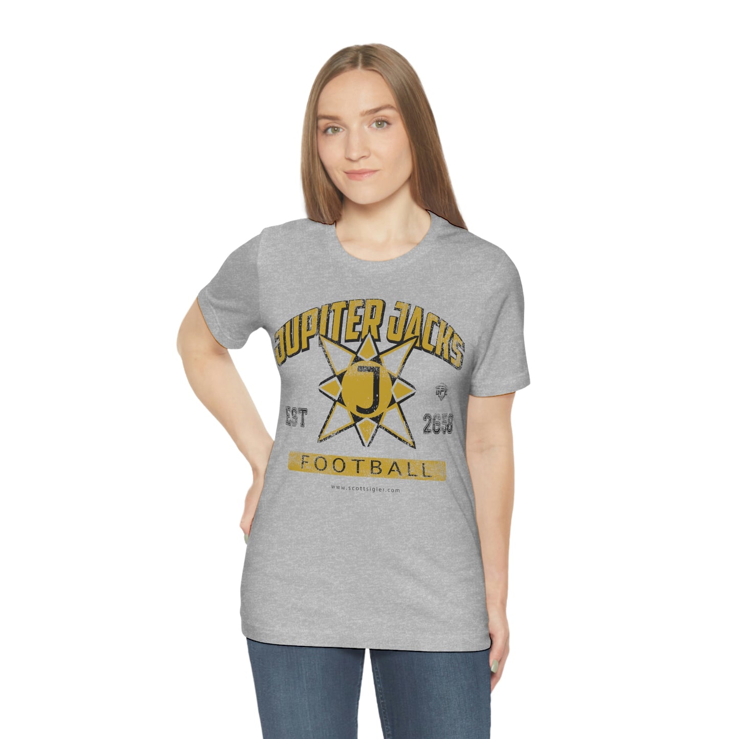 Represent the dominant Jupiter Jacks with a timeless triangled "J" logo. Gold and black on heather.